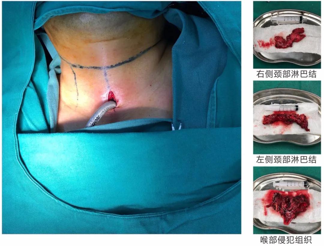 为了将患者颈淋巴组织处理干净,防止再次复发。z终,历时2个半小时,顺利地将患者双侧颈淋巴择区性清扫,喉肿瘤切除,行环状软骨舌骨吻合修复喉功能。